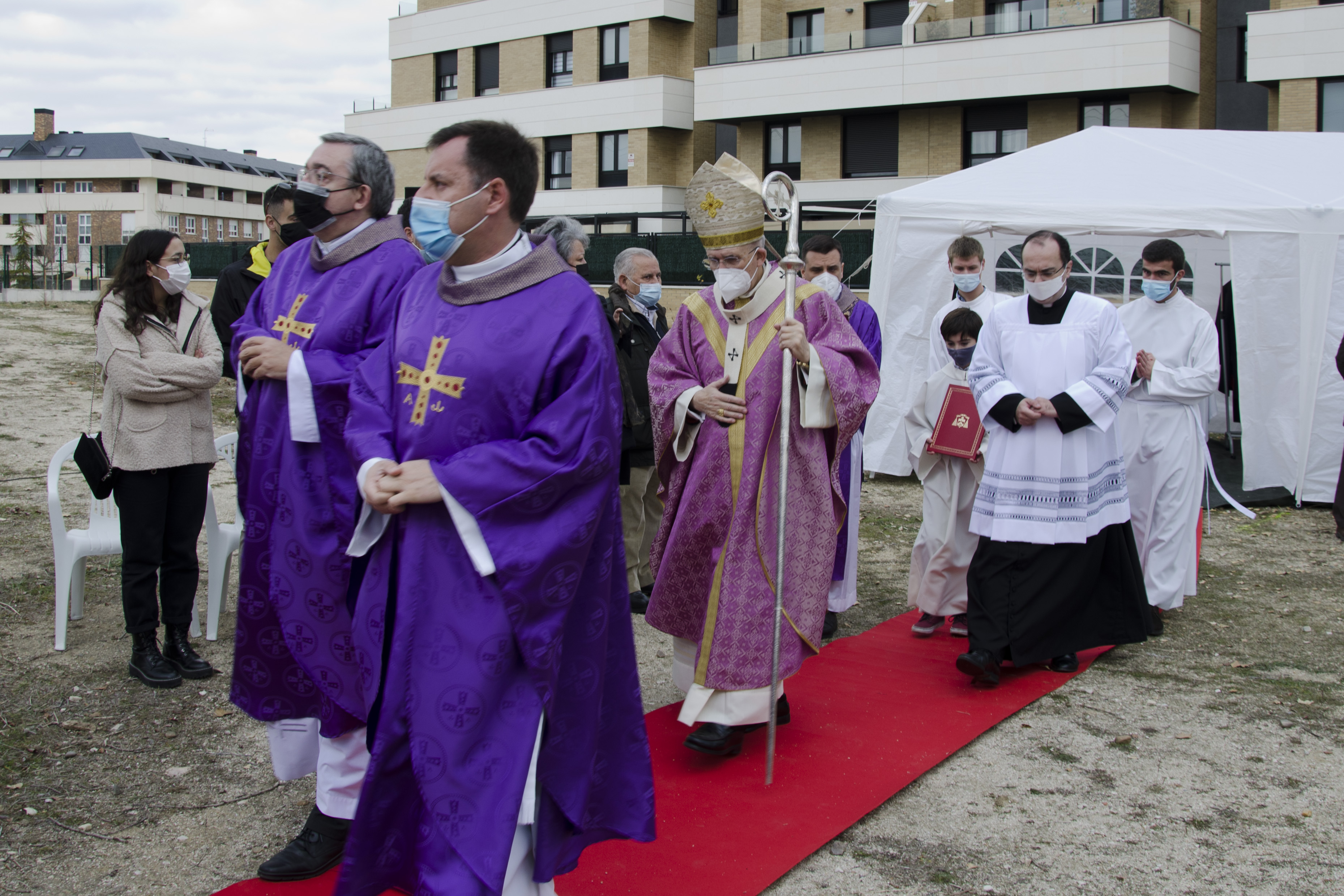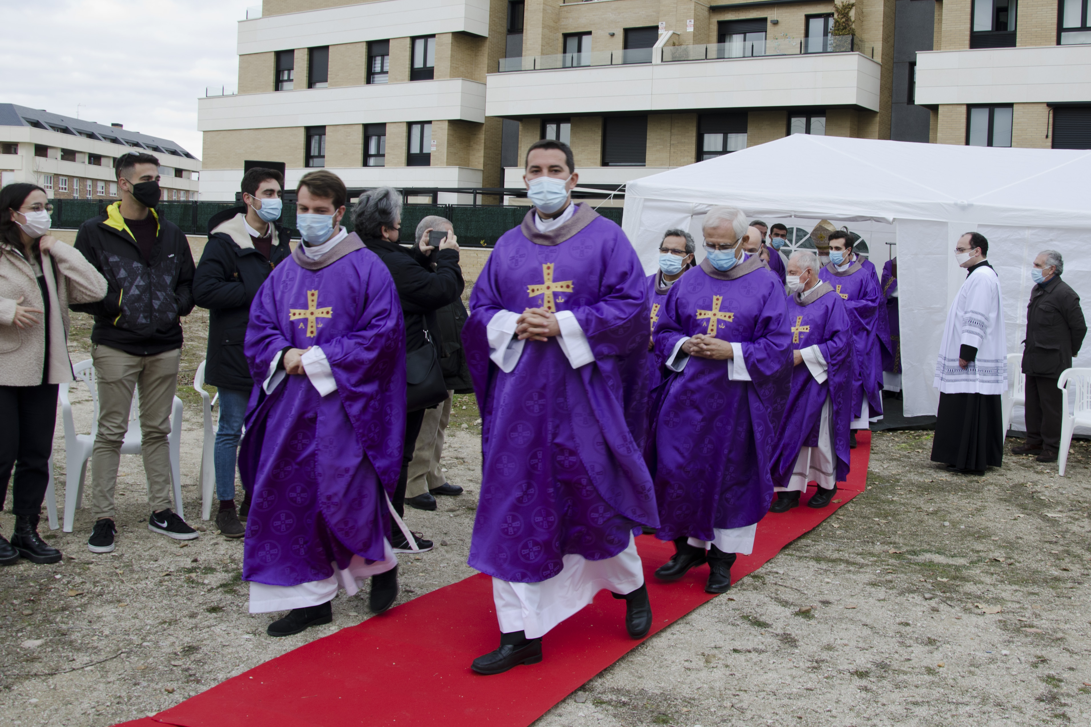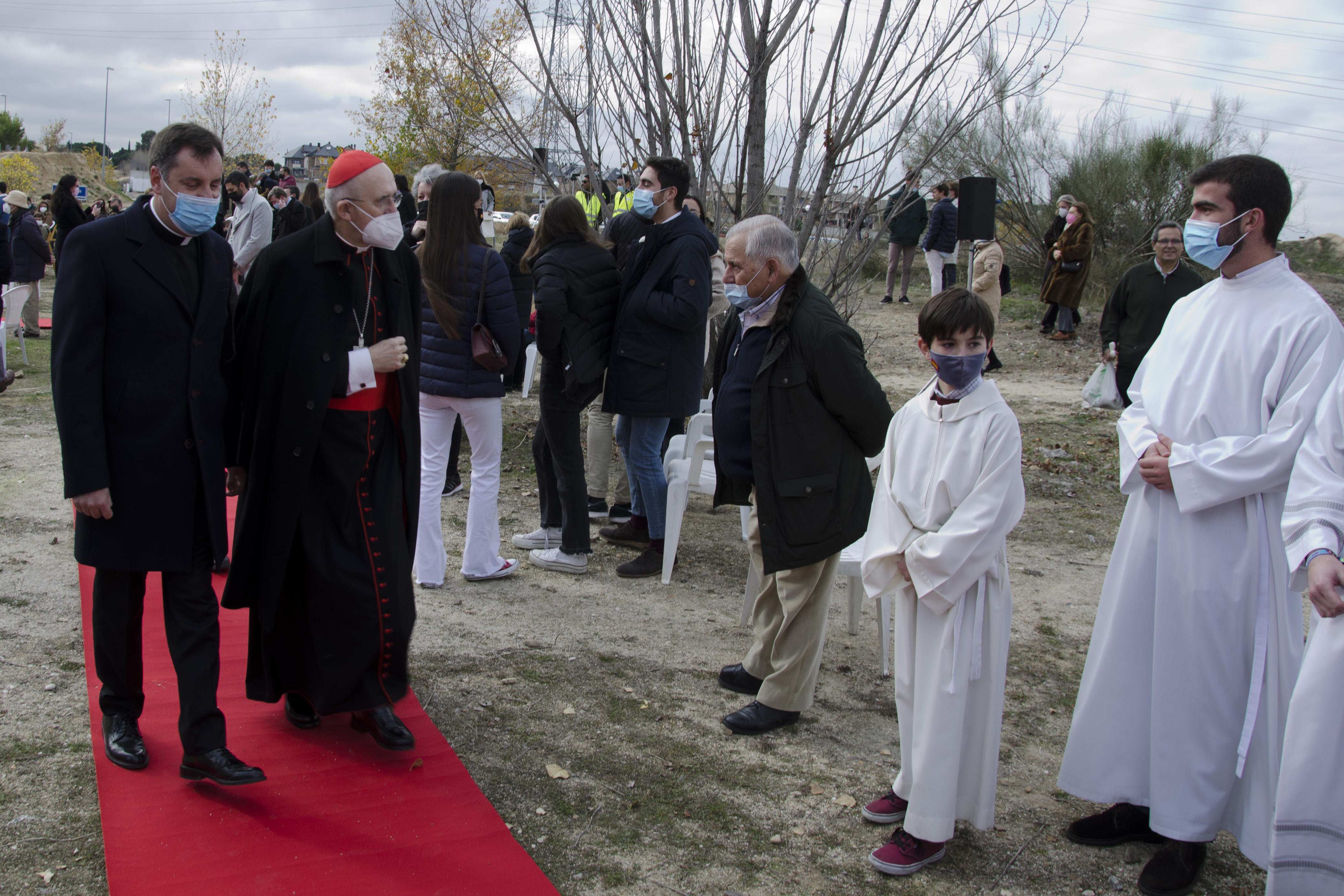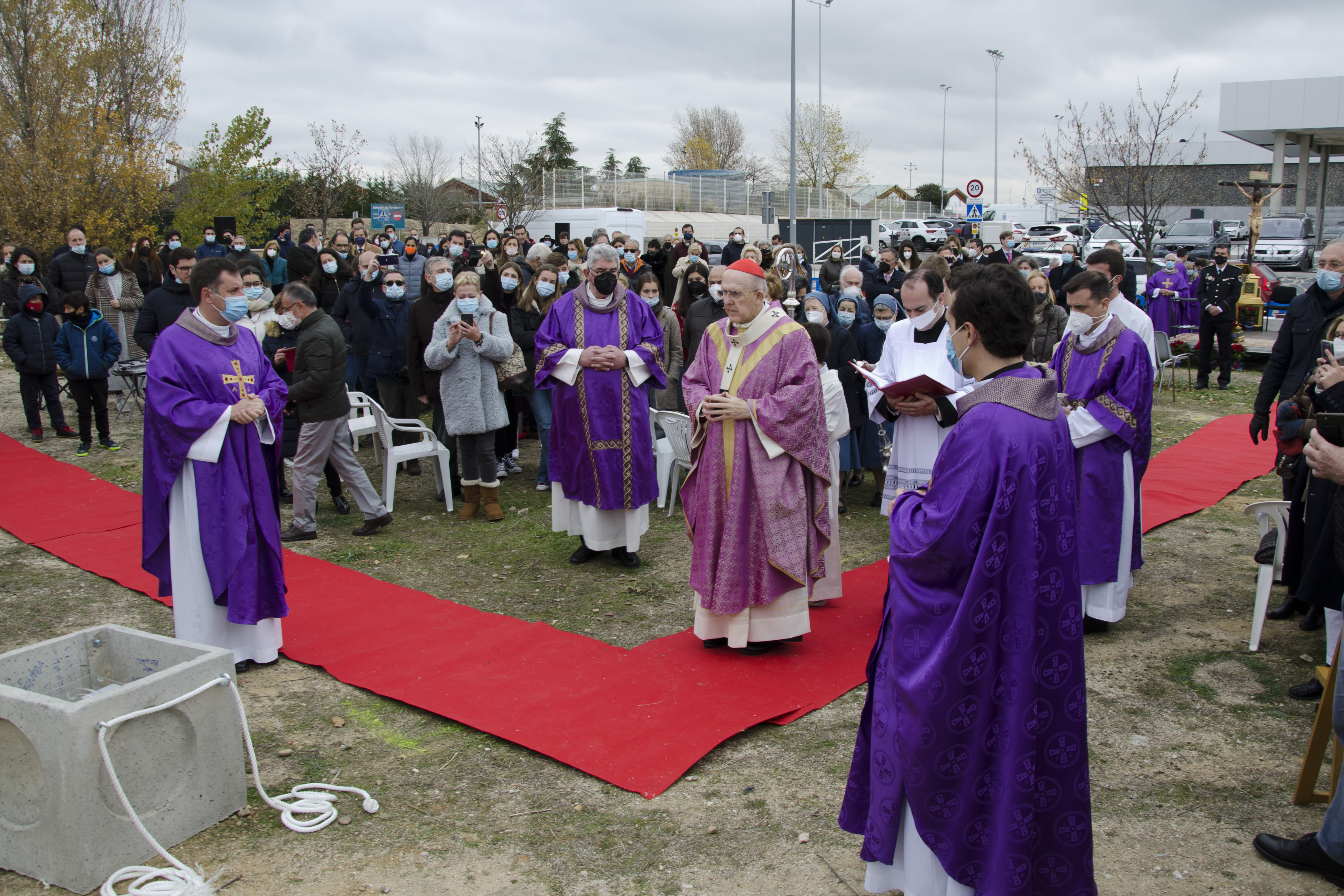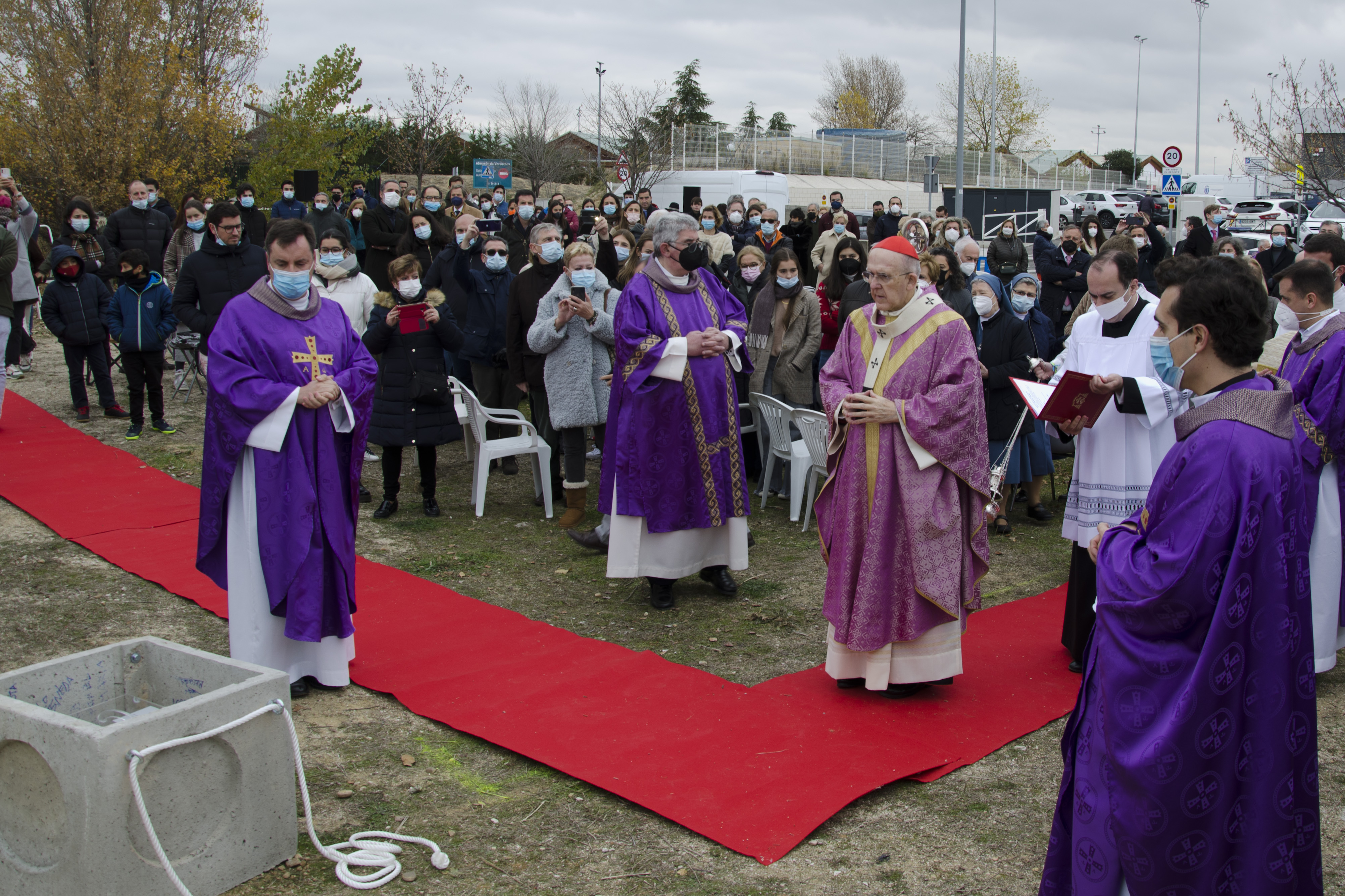 Con gran alegría pudimos asistir a la colocación de la primera piedra del nuevo templo y locales de nuestra parroquia en el terreno que se encuentra en la calle Flauta Mágica esquina Barbero de Sevilla. Lo presidió el Cardenal Arzobispo de Madrid, D. Carlos Osoro acompañado del Cura Párroco D. David Benítez Alonso y con la asistencia de numerosos sacerdotes, entre ellos todos los que habían prestado su servicio en la parroquia.