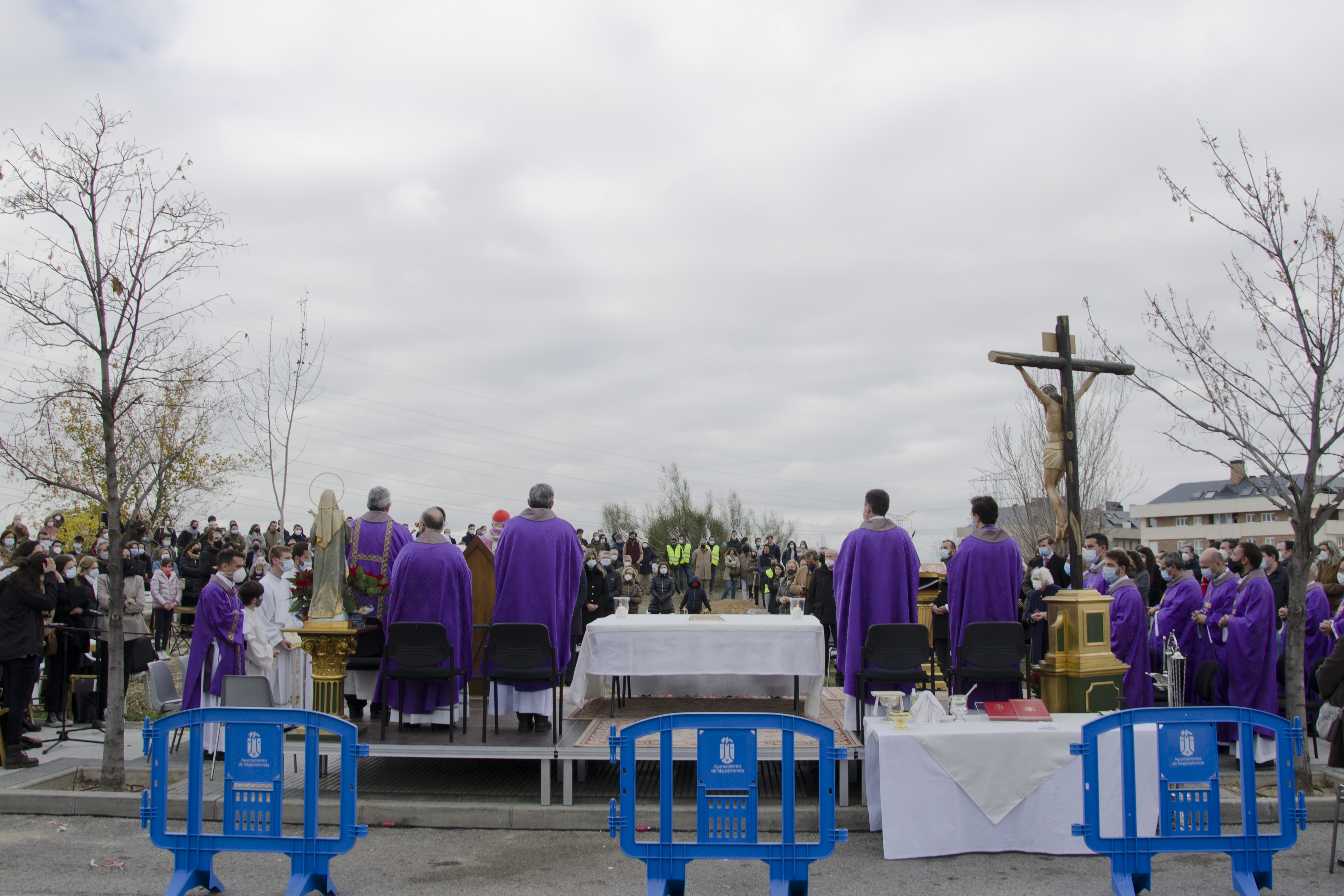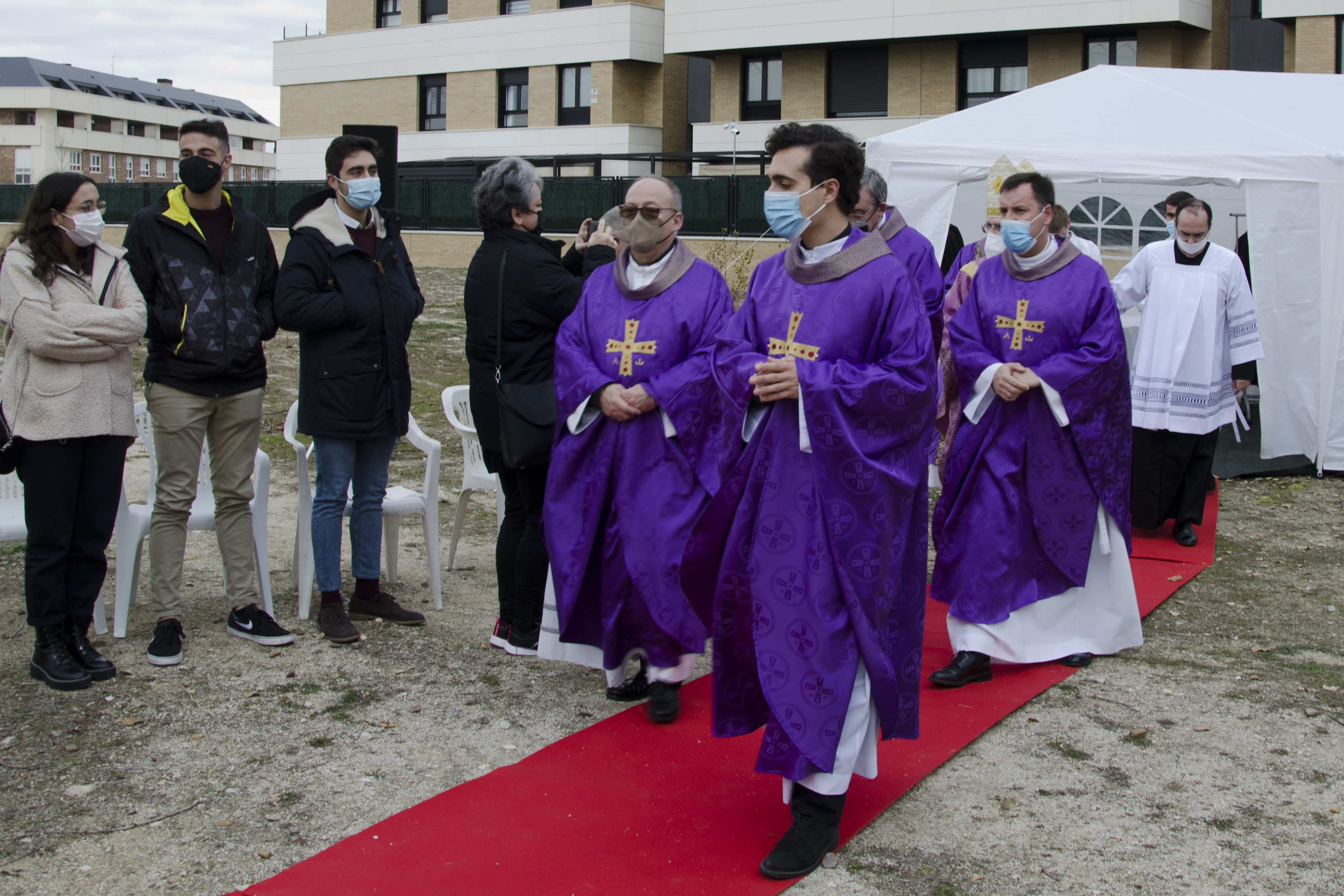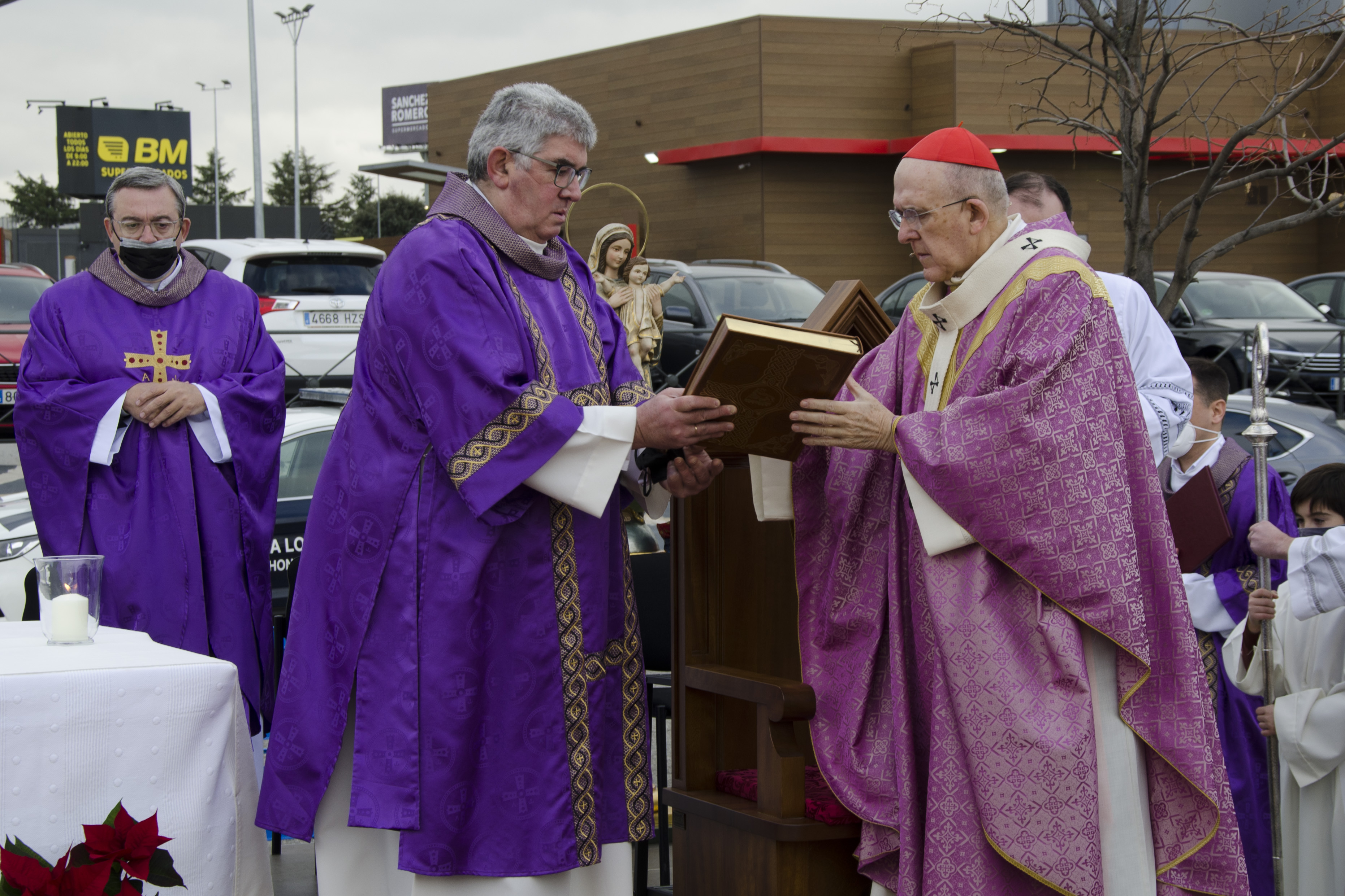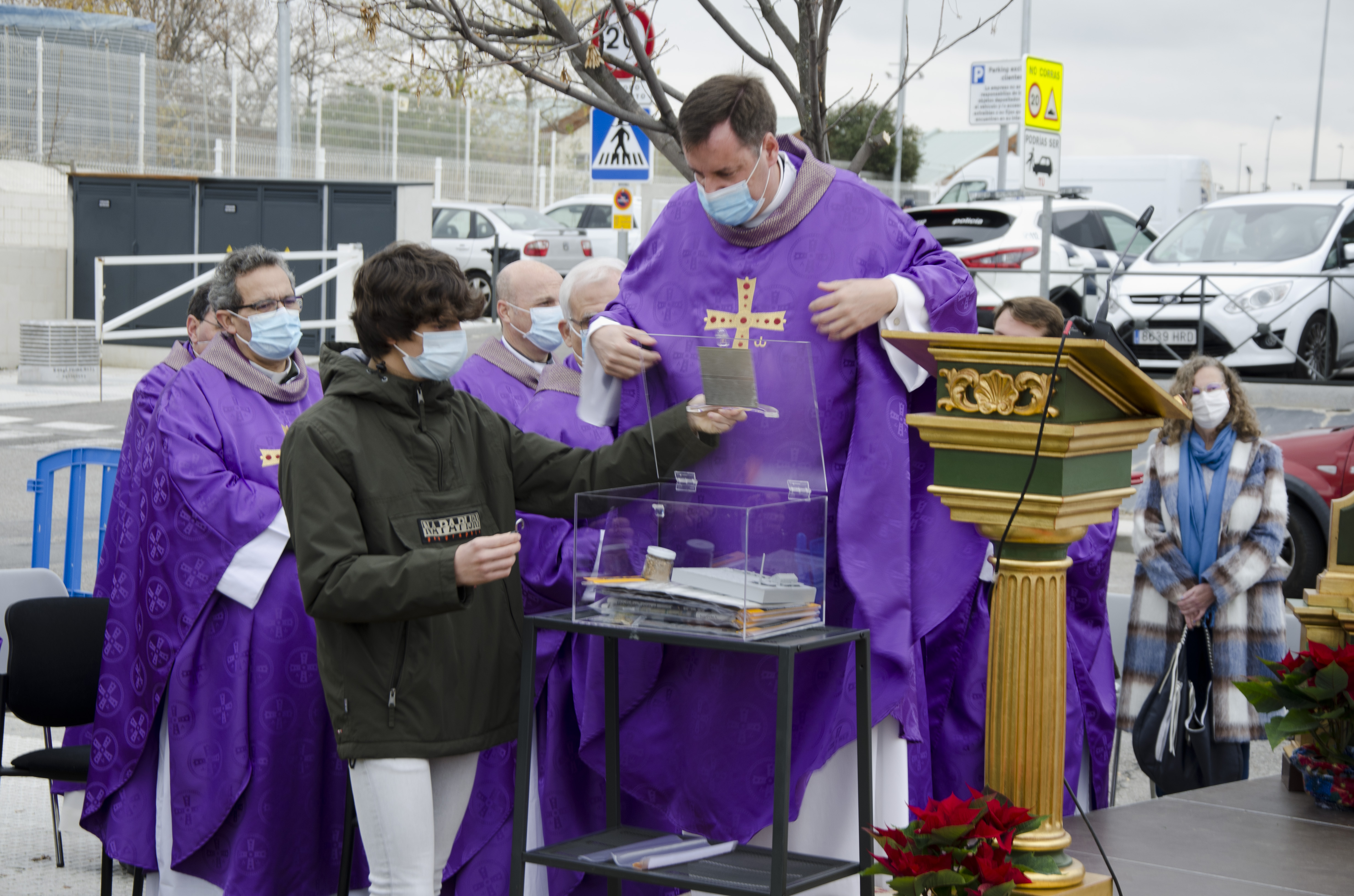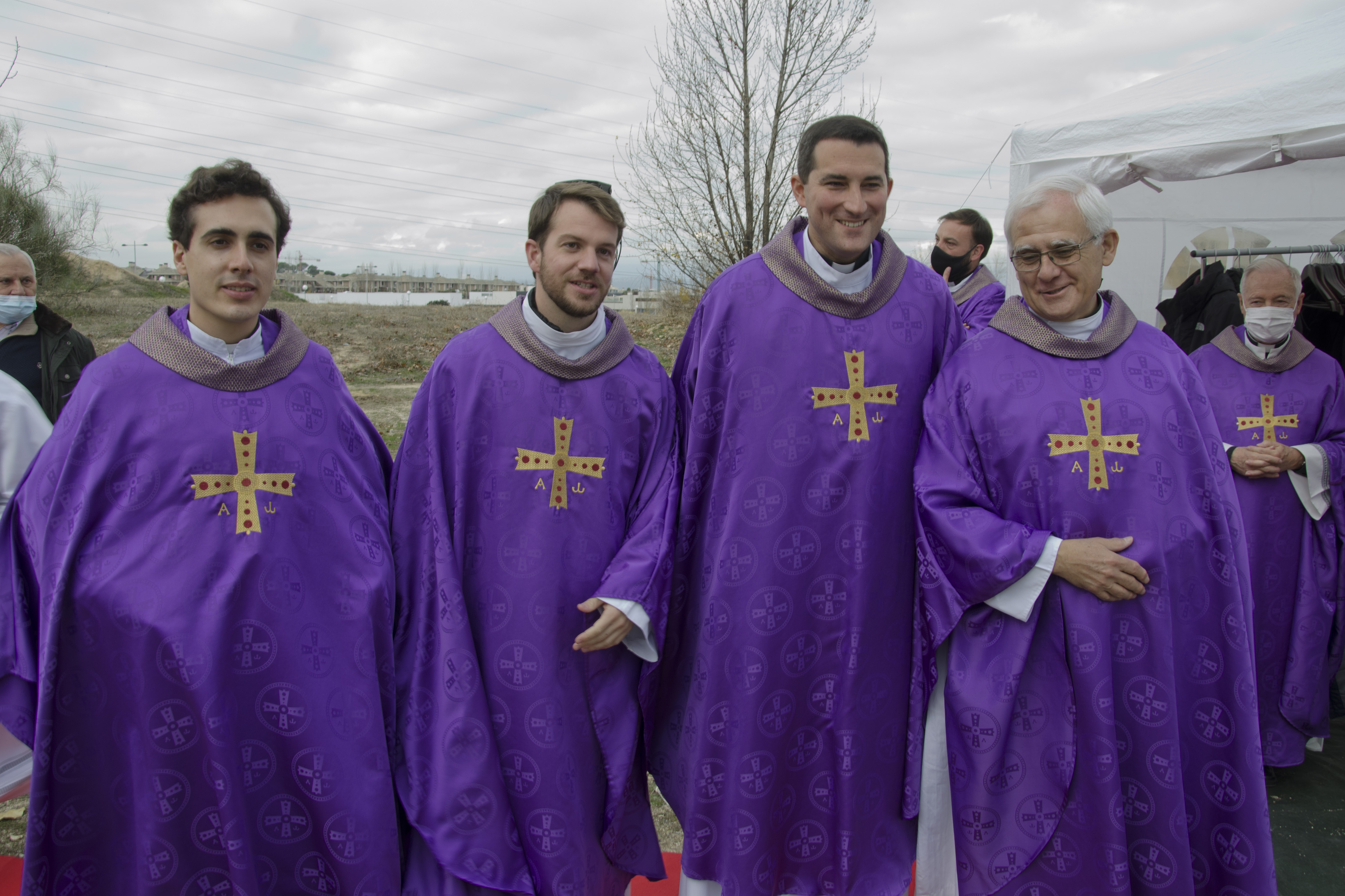 Con gran alegría pudimos asistir a la colocación de la primera piedra del nuevo templo y locales de nuestra parroquia en el terreno que se encuentra en la calle Flauta Mágica esquina Barbero de Sevilla. Lo presidió el Cardenal Arzobispo de Madrid, D. Carlos Osoro acompañado del Cura Párroco D. David Benítez Alonso y con la asistencia de numerosos sacerdotes, entre ellos todos los que habían prestado su servicio en la parroquia.